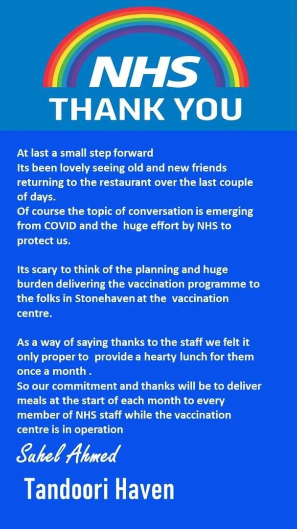 Suhel Ahmed, from Tandoori Haven, said that while they were celebrating welcoming people through their restaurant doors once again, their thoughts were with the “fabulous NHS” who, he said, without their efforts during the pandemic, we would not be in the position we are.